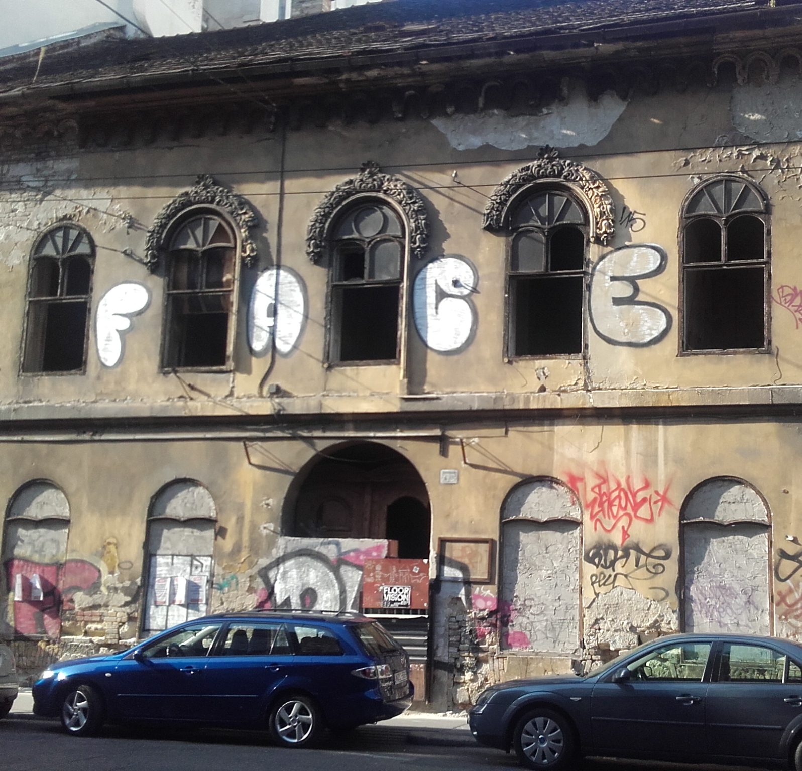 Budapesten jártunk, és a Baross utcán láttam meg ezt a szebb napokra érdemes épületet, melyen a betáblázott ablakok és a sok graffiti között még látszódnak a régi szép stukkók az ablakok körül 🙂