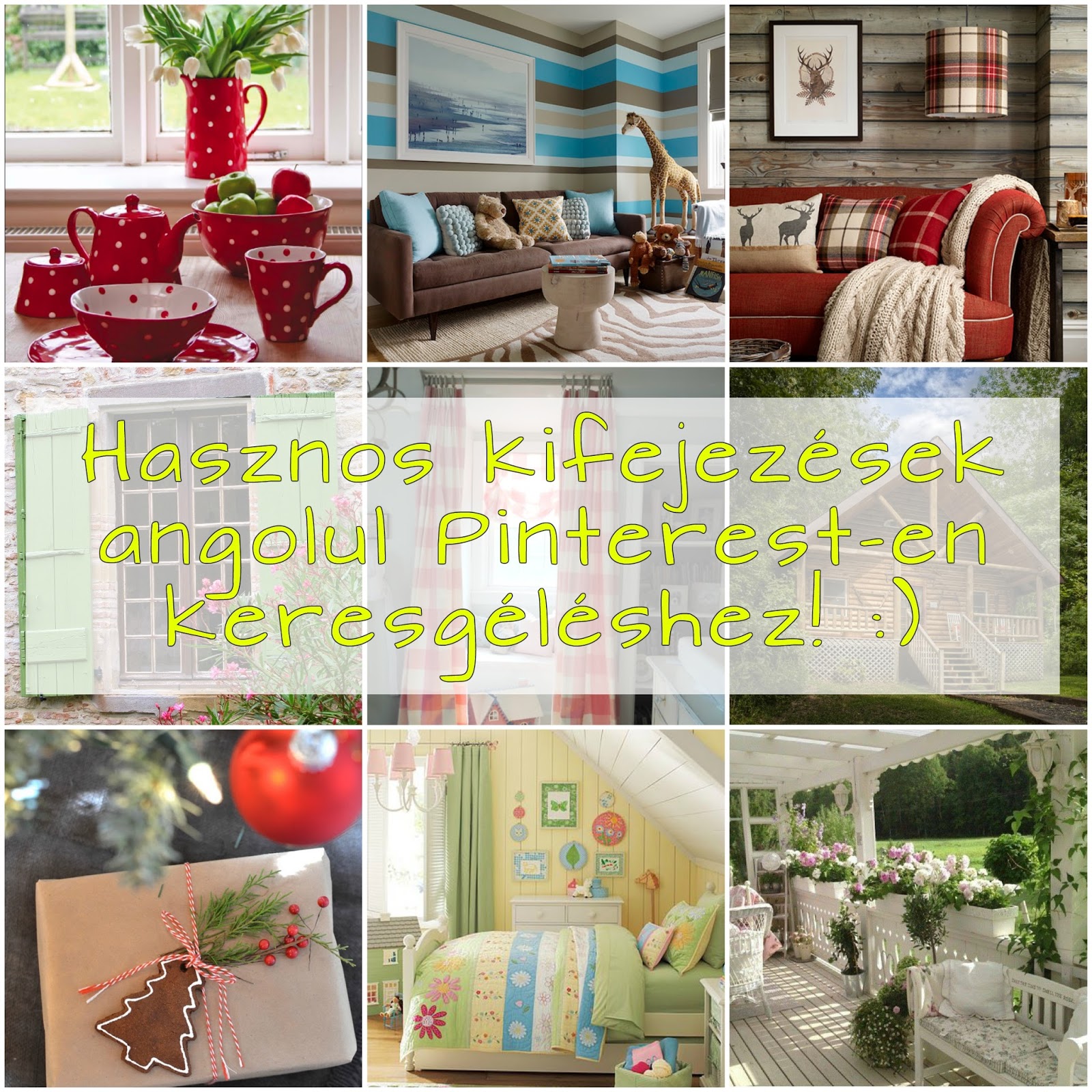 Összegyűjtöttem magamnak az elmúlt egy évben néhány kifejezést, amikre rá szerettem volna keresni Pinterest-en, de úgy kellett kibogarásznom az angol megfelelőjüket, mert a szótárból nem volt egyértelmű, vagy éppen véletlenül bukkantam rájuk, és gyorsan felírtam, mert még hasznos lehet! 🙂 Ezt a listát szeretném most megosztani veletek, illetve kiegészítettem pár alap, lakberendezéssel kapcsolatos kifejezéssel azok számára, akik nem tudnak angolul 🙂